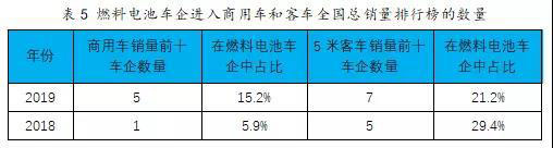 2019年進(jìn)入目錄的燃料電池汽車企業(yè)中,有5家企業(yè)位列商用車2019年全國(guó)總銷售榜前十,進(jìn)入5米以上客車2019年全國(guó)總銷售榜前十的車企也有7家,相比2018年已有明顯提升,主要商用車(含客車)車企對(duì)燃料電池汽車行業(yè)重視度普遍提升。但占全部上榜燃料電池車企數(shù)量的比例分別為15.2%和21.2%,多數(shù)燃料電池車企在傳統(tǒng)汽車行業(yè)實(shí)力不強(qiáng)。