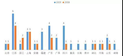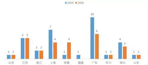 從企業(yè)區(qū)域分布來(lái)看,2019年變化不大,在產(chǎn)業(yè)發(fā)展較早、科研力量較強(qiáng)的地區(qū)聚集效應(yīng)更為明顯。僅廣東、上海、江蘇、湖北四地上榜企業(yè)數(shù)量占比已達(dá)72%。安徽地區(qū)企業(yè)變化較大,4家上榜企業(yè)僅剩1家。