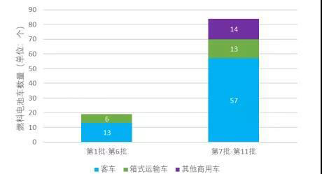 去年下半年數(shù)量大增。2019年上半年列入目錄的燃料電池車數(shù)量較少,第1批-第6批合計(jì)推出19款,而從下半年來(lái)看,第7批-第11批燃料電池車數(shù)量大幅增長(zhǎng)342%,達(dá)84款,接近2018年全年數(shù)量。