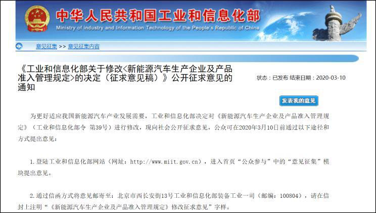 2月10日,工信部發(fā)布《工業(yè)和信息化部關(guān)于修改<新能源汽車生產(chǎn)企業(yè)及產(chǎn)品準(zhǔn)入管理規(guī)定>的決定(征求意見稿)》公開征求意見的通知,具體調(diào)整內(nèi)容主要有: