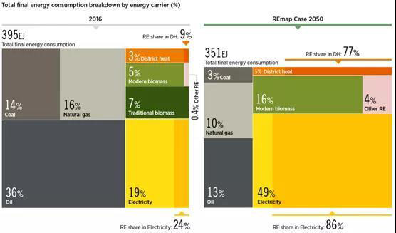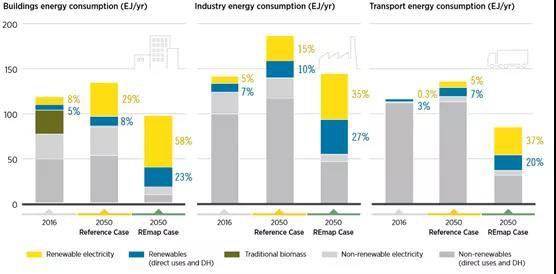 圖1 到2050年,電力將成為主要能源,同時總能耗將減少,可再生能源占比增加