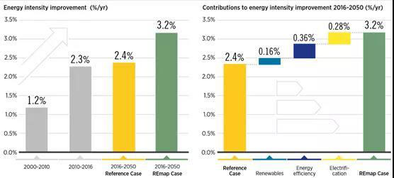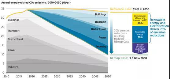 加快可再生能源的部署,結(jié)合深層電氣化和提高能源效率是實(shí)現(xiàn)低碳可持續(xù)發(fā)展的重要手段。2050年可實(shí)現(xiàn)90%的碳減排量,其中僅可再生能源、供熱和運(yùn)輸電氣化就可減少排放的75%。報告分析了碳減排的兩種路徑,即各國正在實(shí)施或計劃實(shí)施的碳排放政策路徑(參考路徑)和基于可再生能源技術(shù)以及提高能源效率的低碳技術(shù)路徑(RE路徑),相比參考路徑,RE路徑下的碳排放可進(jìn)一步減少總量的70%(見圖2)。