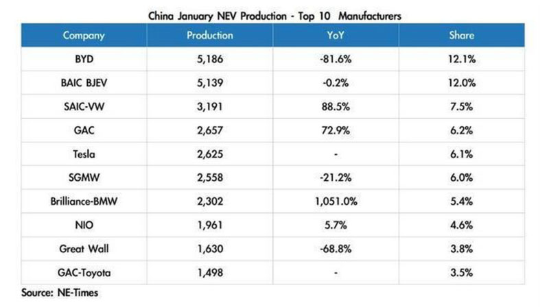 中國前10大電動汽車制造商,分別是:比亞迪、北汽新能源、上汽大眾、廣汽、上汽通用五菱、華晨寶馬、蔚來、長城、廣汽豐田。