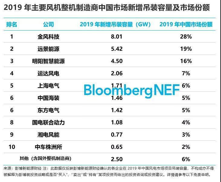 中國(guó)海裝與東方電氣2019年國(guó)內(nèi)新增吊裝容量差距小于50MW,并列第六。