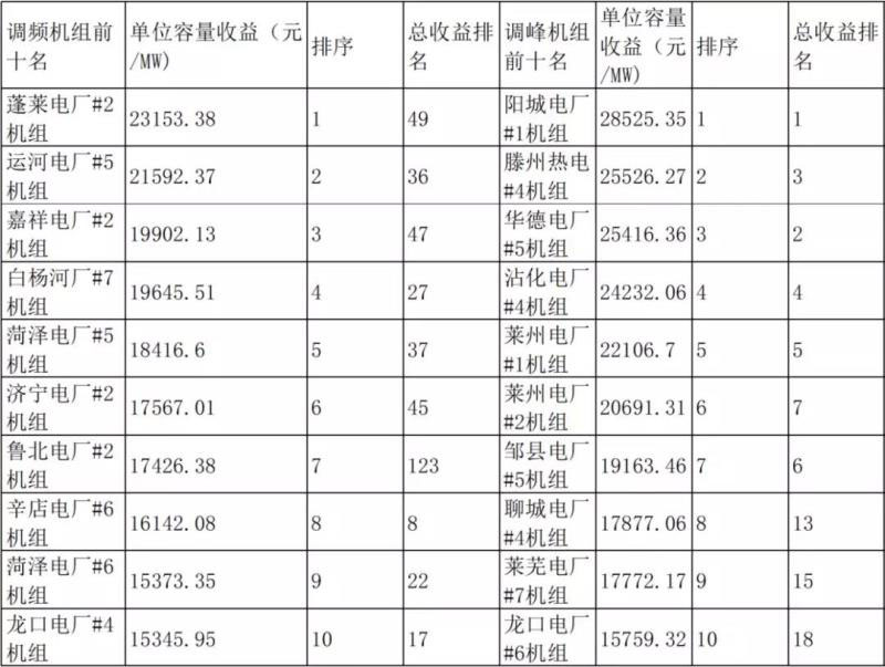 表六 山東調(diào)峰、調(diào)頻收益前十名機組在總收益的排名表