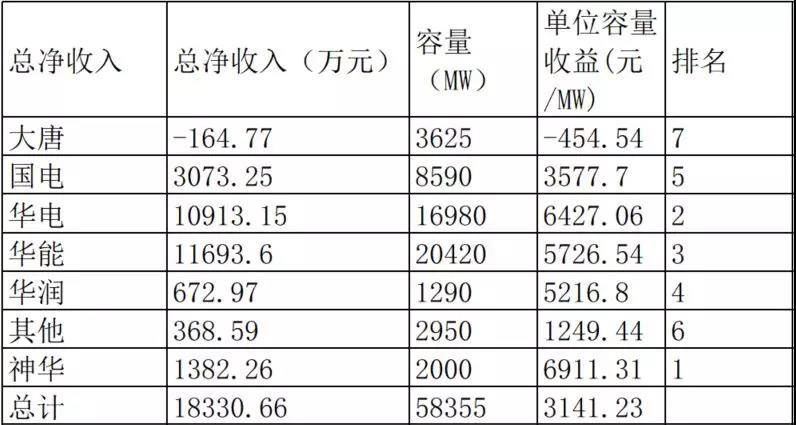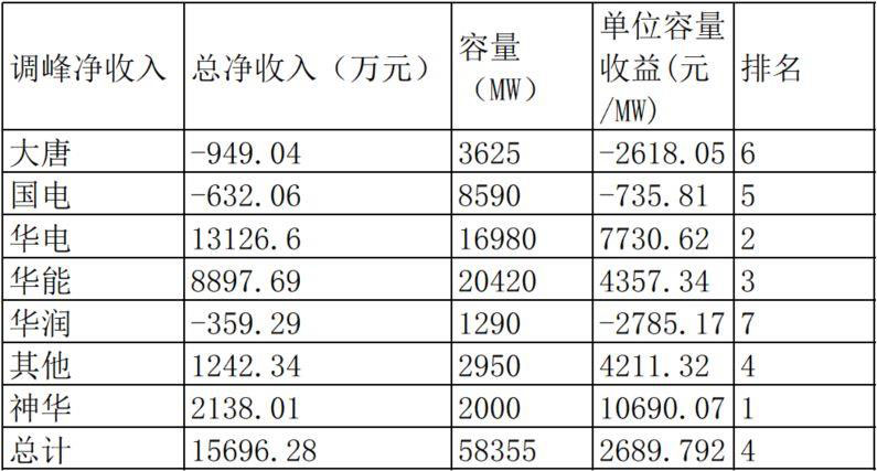 看調(diào)峰凈收入排名情況,第一名是神華集團,最后一名成了華潤集團。從對比上看,押注于調(diào)峰市場的神華集團,是成績最好的選手。