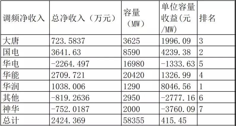 再看調(diào)頻凈收入排名情況,第一名是華潤集團,最后一名成了神華集團。而在總凈收入里最后一名大唐集團的收益排名,升到了第三名。