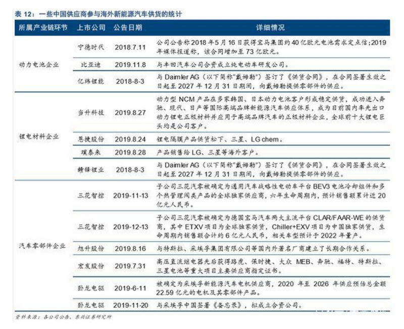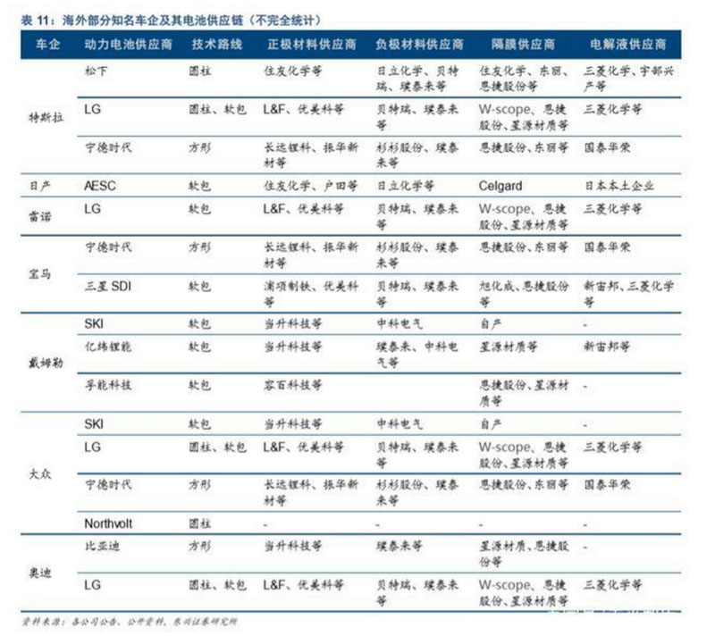 我們梳理了海外部分知名車企及其動力電池供應(yīng)鏈體系,如表 11 所示。從中可見,中國的部分動 力電池及相關(guān)材料供應(yīng)商,已參與其中。