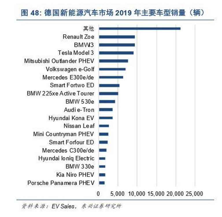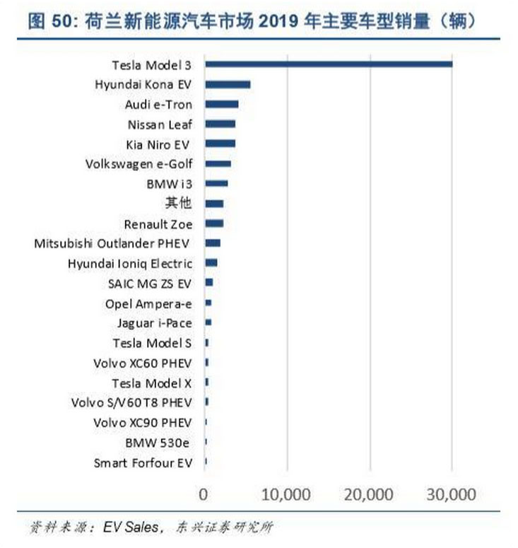 從 EV Sales 發(fā)布的 2019 年德國、法國、荷蘭、挪威的新能源汽車品牌排行榜來看,Tesla Model 3、 雷諾 Zoe、日產(chǎn)聆風(fēng)等純電動車型受歡迎程度較高,如圖48~51 所示。其中,Tesla Model 3 在四國市 場皆位列前三,在荷蘭占據(jù) 44.9%份額;雷諾 Zoe 在法國占據(jù) 30.6%份額,在德國市場亦排名第一;日 產(chǎn)聆風(fēng)在法國、荷蘭、挪威市場皆位列前四。