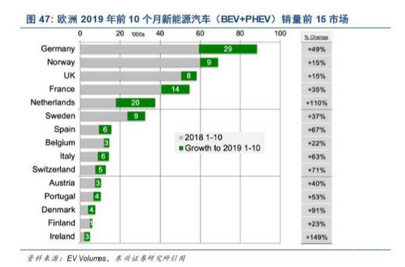 2019 年歐洲新能源汽車市場便已呈現(xiàn)較高增速,與中國市場產(chǎn)銷下降的局面形成對比。據(jù) EV Volumes 發(fā)布的數(shù)據(jù),2019 年前 10 個月,歐洲市場的純電動(BEV)和插電式混合動力(PHEV)車 銷量為 45.14 萬輛,同比增長 39%,如圖 47 所示。其中,德國、挪威、英國、法國、荷蘭、瑞典位列 前六強(qiáng),荷蘭、德國的銷量同比增速分別達(dá)到 110%、49%。