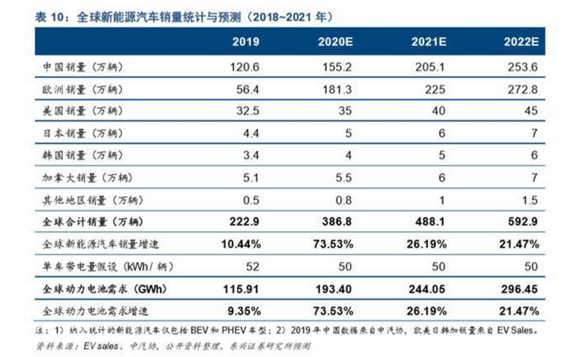 放眼全球,新能源汽車市場發(fā)展呈現(xiàn)加速之勢,歐洲市場將持續(xù)貢獻(xiàn)重要增量。綜合 EV-sales 和中 汽協(xié)統(tǒng)計數(shù)據(jù),我們測算,2019 年全球新能源汽車市場合計銷量為 222.9 萬輛;我們預(yù)計,2020 年有 望達(dá)到 386.8 萬輛,同比增長 73.53,其中海外市場銷量 231.6 萬輛,同比增長 1.26 倍,如表 10 所示。