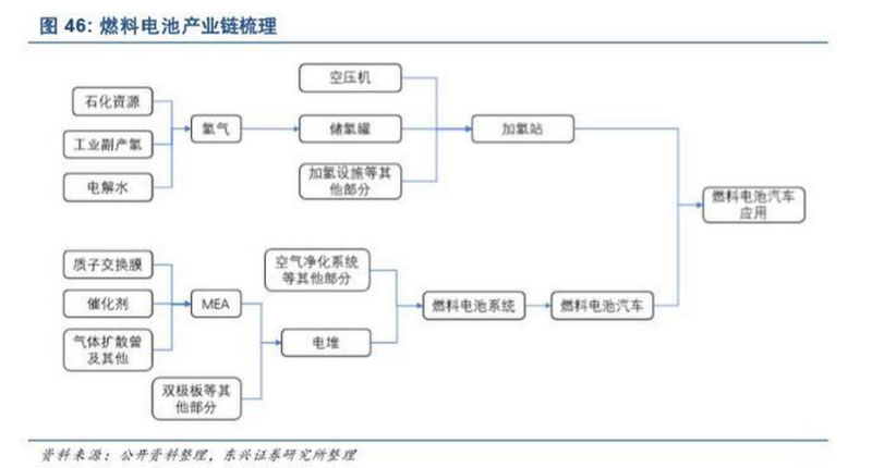 FCV 產(chǎn)業(yè)鏈環(huán)節(jié)眾多,如圖 46 所示,包括兩條主線:燃料電池研發(fā)與制造主線,包括質(zhì)子交換膜、 催化劑、雙極板、電堆集成等多個環(huán)節(jié);氫燃料主線,包括上游氫氣制備、中游氫氣存儲、加氫站運營 等多個環(huán)節(jié)。
