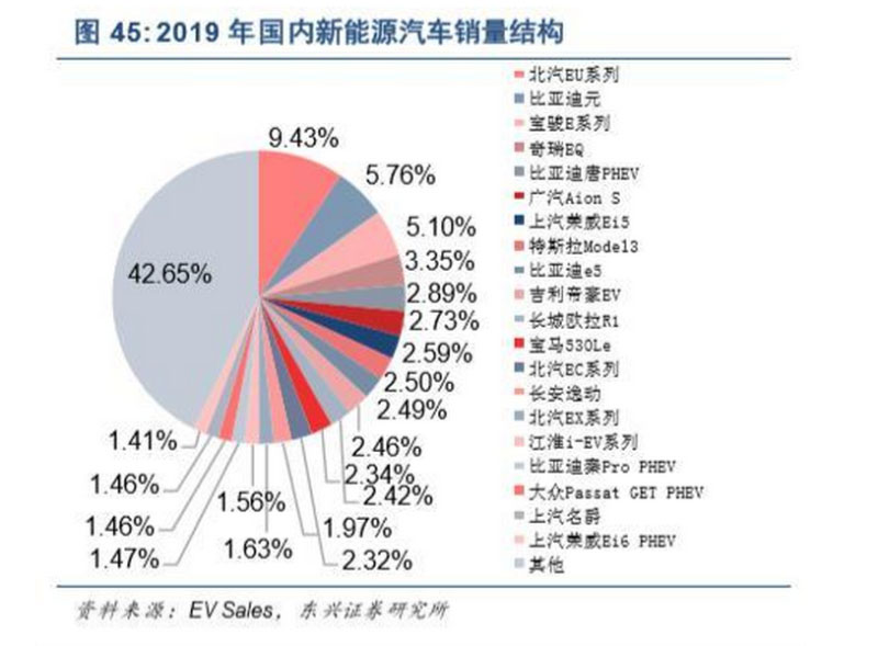 汽車的消費屬性很強(qiáng),品牌認(rèn)知很重要,而一些外資品牌在中國市場具有較高的認(rèn)知度。中汽協(xié)統(tǒng) 計數(shù)據(jù)顯示,國內(nèi)自主品牌在乘用車市場的合計份額常年維持在 38%~46%之間,如圖 44 所示;海外品 牌中,德系車在中國市場的品牌認(rèn)知度領(lǐng)先,市場份額約 20%。從 2019 年前 11 個月的中國大陸新能 源乘用車細(xì)分市場來看,國內(nèi)車企占據(jù)主流地位,特斯拉和寶馬車型在華有少量銷售,外資品牌車型闖 入銷量前 20 名者甚寡,如圖 45 所示。我們認(rèn)為,出現(xiàn)上述差異的主要原因有:過去幾年我國通過財政 補(bǔ)貼、公交與公務(wù)車采購等多種方式及渠道對本土新能源汽車產(chǎn)業(yè)給予支持;多數(shù)外資品牌新能源汽車 在中國市場尚未進(jìn)入大規(guī)模推廣階段。