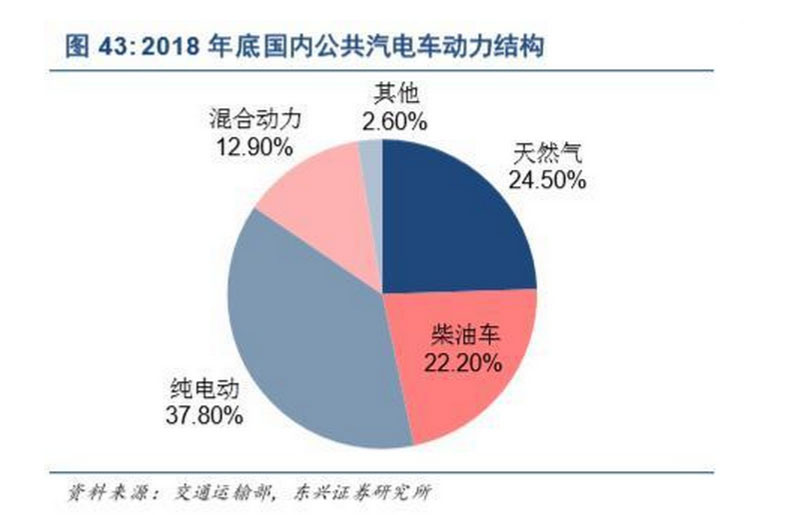 對于公交車市場,交通運輸部數(shù)據(jù)顯示,2018 年末,全國擁有公共汽電車 67.34 萬輛,純電動占 比 37.8%,混合動力占比 12.9%,合計占比已經(jīng)達(dá)到 50.7%,24.5%是天然氣車,如圖 43 所示,可見 公交車領(lǐng)域電動化替代空間較為有限。