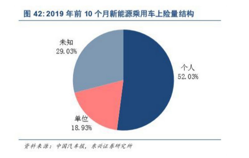 2019 年中國大陸銷售的新能源汽車中,乘用車占比88.2%,如圖 41 所示。但是,新能源乘用車在 中國個人消費市場的品牌與價值認(rèn)可度仍待提升。當(dāng)前乘用車銷量中包含了流向網(wǎng)約車市場的車輛,總 量數(shù)據(jù)并不能真實反映個人消費者需求強(qiáng)度。據(jù)微信公眾號“中國汽車報”2019 年 12 月 18 日文章報道, 2019 年前 10 個月,新能源乘用車?yán)塾嬌想U量為 71.3 萬輛,從所有權(quán)屬性來看,個人、單位分別占比 52%、19%;另有 20.7 萬輛的上險量所有權(quán)為“未知”,占比 29%。如圖42 所示。假設(shè)新能源商用車都 銷售給非個人車主,且前述上險量統(tǒng)計與全年情況一致,則 2019 年銷售給個人消費者的乘用車在新能 源汽車總銷量中的占比測算值為 45.86%??梢?,新能源汽車個人消費市場仍有很大挖掘潛力。