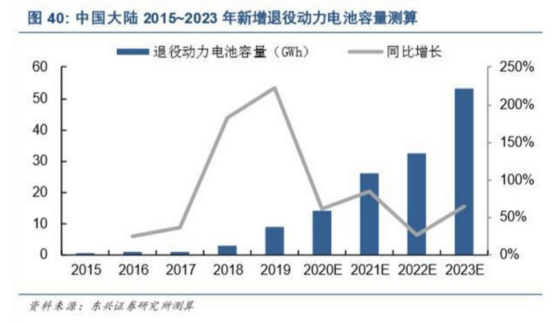 隨著鋰電系新能源汽車加大推廣,動力電池退役后的管理問題被提上議事日程。我們預(yù)估,2015~ 2019 年期間步入退役期(含已處理)的動力電池不足 15GWh,而 2020~2023 年期間預(yù)計將累計新增 超過 120GWh 退役動力電池,如圖 40 所示。