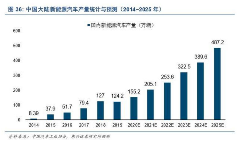我們合理假設(shè),2025 年我國汽車銷量為 2,700 萬輛,則前述 25%目標(biāo)對應(yīng)的新能源汽車銷量預(yù)期 為 675 萬輛,較 2019 年實際銷量(120.6 萬輛)的年復(fù)合增速約 33.2%。我們認(rèn)為,這反映了決策層 對新能源汽車產(chǎn)業(yè)的長期支持態(tài)度,但 2025 年銷量占比目標(biāo)能否實現(xiàn),存在一定程度的不確定性。我 們目前對 2025 年新能源汽車產(chǎn)量的預(yù)測為 487.6 萬輛(含外資品牌新能源乘用車 259.5 萬輛),低于前 述目標(biāo)測算數(shù)據(jù),如圖 36 所示。