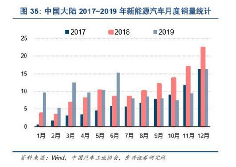 但補(bǔ)貼政策帶來的性價比不具備可持續(xù)性。在國內(nèi)補(bǔ)貼額度退坡幅度較大的 2019 年下半年,新能 源汽車的銷量從 7 月開始就出現(xiàn)了連續(xù) 6 個月的同比負(fù)增長,如圖 35 所示, 2019 全年產(chǎn)量、銷量分 別同比下滑 2.3%至 124.2 萬輛、下滑 4.0%至 120.6 萬輛。