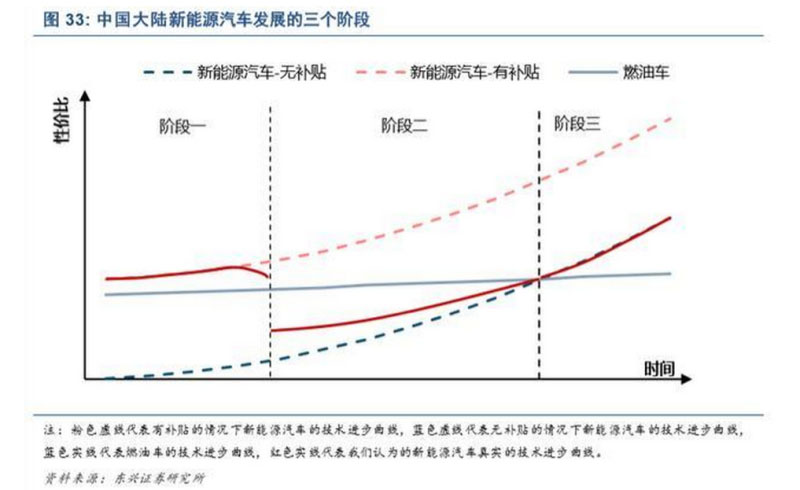 新能源汽車是相對于傳統(tǒng)燃油車而言的,其本質(zhì)是汽車驅(qū)動力由化石燃料向電力的轉(zhuǎn)換。因為化石 燃料和內(nèi)燃機(jī)作為交通工具主要的驅(qū)動力已經(jīng)有一百多年歷史,其變革需要技術(shù)進(jìn)步、政策推動、出行 習(xí)慣改變等多方面共同努力,這就決定了新能源汽車替代傳統(tǒng)燃油車的進(jìn)程是一個漫長的過程。我們認(rèn) 為在傳統(tǒng)燃油車主導(dǎo)的時代,新能源汽車的發(fā)展或經(jīng)歷三個階段。如圖 33 所示。