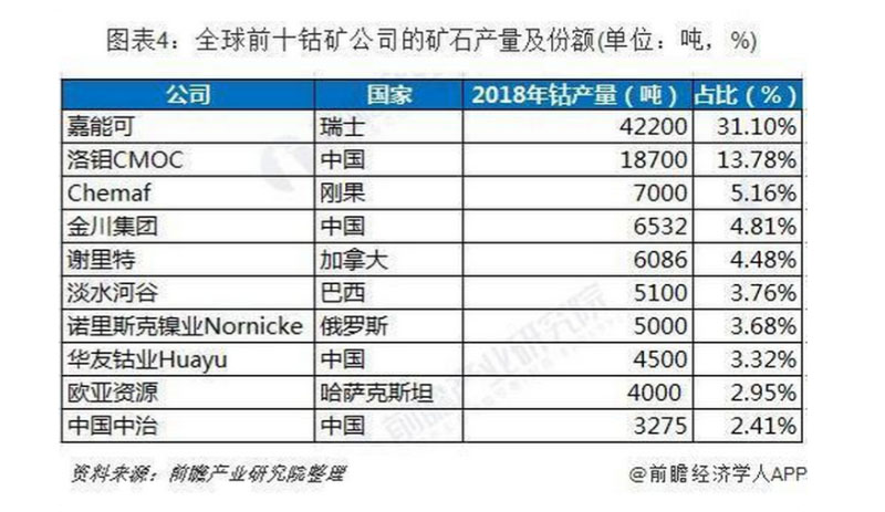 但是,企業(yè)角度看,情況又有不同,全球主要的鈷礦公司有嘉能可公司、洛鉬集團、Chemaf公司、金川集團和謝里特公司等。嘉能可公司掌控著全球鈷礦探明儲量的25%,每年的鈷礦產量占到全球產量的30%左右,對全球鈷礦的供應有決定性的影響力。全球前十大鈷礦公司2018年的鈷礦產量占到全球鈷礦產量的75.45%,生產集中度比較高,中國有四家公司進入鈷礦產量前十的行列。