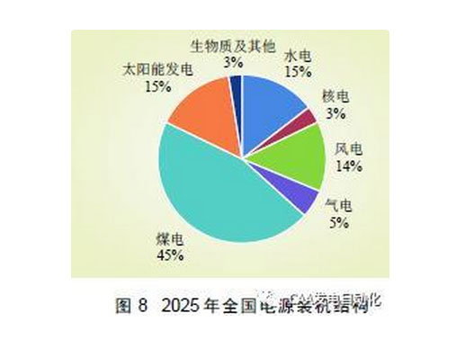 (1)以保障系統(tǒng)安全為前提。深化高比例新能源接入對(duì)電力系統(tǒng)運(yùn)行影響的機(jī)理認(rèn)識(shí),通過(guò)技術(shù)和管理手段,多措并舉,保障電力系統(tǒng)安全。(2)將就地、就近利用作為重點(diǎn)。優(yōu)先在用電負(fù)荷附近開(kāi)發(fā)新能源,減少遠(yuǎn)距離輸送消納。(3)充分發(fā)揮市場(chǎng)配置資源的作用。統(tǒng)籌中長(zhǎng)期和現(xiàn)貨市場(chǎng)、省間和省內(nèi)市場(chǎng),通過(guò)市場(chǎng)手段促進(jìn)新能源發(fā)展與消納。(4)友好接入,與其他電源相協(xié)調(diào)。提升新能源并網(wǎng)友好性,統(tǒng)籌規(guī)劃抽蓄、火電機(jī)組靈活性改造、需求側(cè)響應(yīng)、電化學(xué)儲(chǔ)能等靈活性資源,確保電網(wǎng)調(diào)節(jié)能力與系統(tǒng)備用充足。(5)持續(xù)健全年度預(yù)警機(jī)制。加強(qiáng)新能源項(xiàng)目新增規(guī)模管理,深化年度投資預(yù)警和監(jiān)管制度。(6)多能互補(bǔ)、多網(wǎng)協(xié)同。電源側(cè)發(fā)揮風(fēng)光水的出力互補(bǔ)作用,負(fù)荷側(cè)高效運(yùn)用電熱冷氣的協(xié)同特性。綜合分析國(guó)家能源轉(zhuǎn)型要求、清潔能源消納目標(biāo)以及新能源成本快速下降等因素,預(yù)計(jì)“十四五”期間,全國(guó)年度新增光伏裝機(jī)容量有望超過(guò)4000 萬(wàn)k W, 年度新增風(fēng)電裝機(jī)有望達(dá)到2500 萬(wàn)kW,到2025 年,全國(guó)新能源總裝機(jī)規(guī)模在7.5 億~8.0 億kW,占全國(guó)電源總裝機(jī)的26%~28%,發(fā)電量占比約為12%。2025 年全國(guó)電源裝機(jī)結(jié)構(gòu)如圖8 所示。