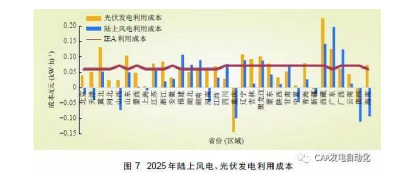根據(jù)IEA 研究提出的系統(tǒng)成本, 取折中值0.061元/(kW·h)、東部省份不考慮輸電成本進(jìn)行分析,比對(duì)各省光伏發(fā)電、陸上風(fēng)電度電成本與燃煤標(biāo)桿電價(jià)之差,2025 年,廣東、福建、遼寧等少數(shù)省份可以實(shí)現(xiàn)平價(jià)利用,如圖7 所示。但是,考慮到中國(guó)為大陸季風(fēng)性氣候、風(fēng)電保證出力相比歐美要低、新能源發(fā)電預(yù)測(cè)精度尚有差距、煤電比重高等因素,中國(guó)新能源并網(wǎng)帶來(lái)的系統(tǒng)成本要比歐美更高,達(dá)到平價(jià)利用的省份實(shí)際上還要少一些。