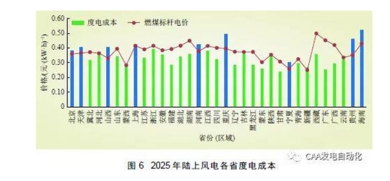 (3)陸上風(fēng)電度電成本。在考慮目前燃煤脫硫標(biāo)桿電價(jià)水平不變、未來(lái)部分省份(區(qū)域)棄風(fēng)好轉(zhuǎn)、風(fēng)電利用小時(shí)數(shù)有所提高等邊界條件下,對(duì)2025 年各省陸上風(fēng)電度電成本進(jìn)行測(cè)算,基本在0.24~0.40 元/(kW·h)之間,大部分省份(區(qū)域)陸上風(fēng)電可實(shí)現(xiàn)發(fā)電側(cè)平價(jià)上網(wǎng)(除重慶、天津、山西等省份(區(qū)域)之外),如圖6所示。另外,根據(jù)測(cè)算,2025 年江蘇、廣東的海上風(fēng)電接近平價(jià)上網(wǎng)。