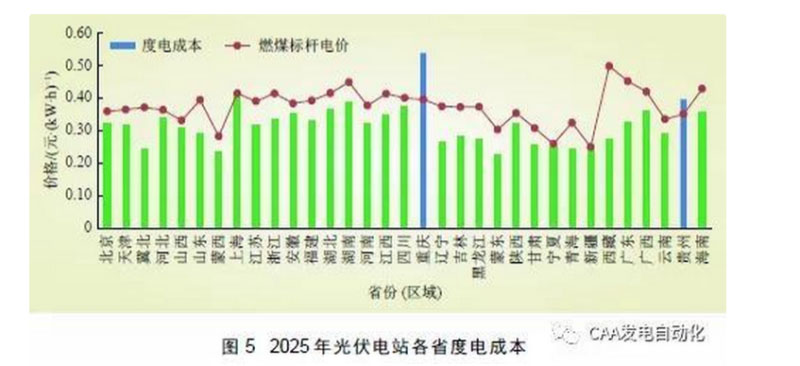 (2)光伏電站度電成本。在考慮目前燃煤脫硫標(biāo)桿電價(jià)水平不變、未來(lái)部分省份(區(qū)域)棄光好轉(zhuǎn)、光伏發(fā)電利用小時(shí)數(shù)有所提高等邊界條件下,對(duì)2025 年各?。▍^(qū)域)光伏電站度電成本進(jìn)行測(cè)算,基本在0.23~0.40 元/(kW·h)之間,絕大部分省份( 區(qū)域) 可實(shí)現(xiàn)發(fā)電側(cè)平價(jià)上網(wǎng)(除重慶和貴州之外),如圖5所示。