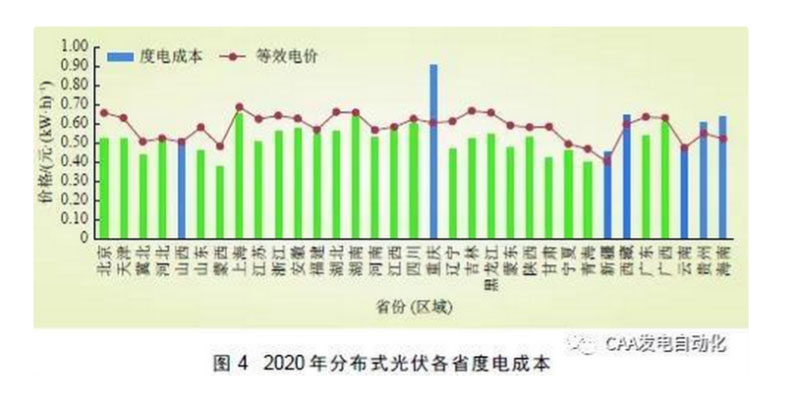 ( 1 ) 分布式光伏發(fā)電度電成本。根據(jù)2018 年各省分布式光伏項(xiàng)目平均利用小時(shí)數(shù),按照自用電量占比80%、結(jié)算價(jià)格為銷售目錄電價(jià)85 折進(jìn)行測(cè)算,2020 年分布式光伏度電成本基本在0.38~0.60 元/(kW·h)之間,大部分省份(區(qū)域)可實(shí)現(xiàn)用戶側(cè)平價(jià)上網(wǎng)(除重慶、山西、貴州等少數(shù)省份外),如圖4 所示。