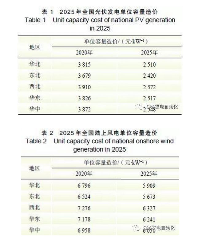 2019 年初以來(lái),作者對(duì)多家行業(yè)協(xié)會(huì)、研究機(jī)構(gòu)、權(quán)威人士和項(xiàng)目業(yè)主開(kāi)展訪談?wù){(diào)研,結(jié)果表明,未來(lái)一段時(shí)期光伏發(fā)電和海上風(fēng)電的建設(shè)成本仍有一定下降空間, 陸上風(fēng)電下降空間不大,預(yù)計(jì)2020 年中國(guó)光伏電站、陸上風(fēng)電和海上風(fēng)電的單位容量造價(jià)分別為3800、6900 和14000 元/kW,2025 年有望降到2500、6000 和12000 元/ kW,不同地區(qū)光伏發(fā)電和陸上風(fēng)電造價(jià)分別如表1 和表2 所示。