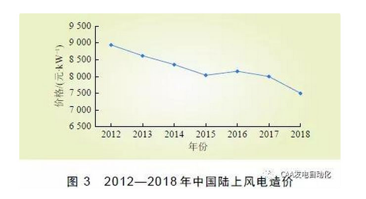 隨著中國(guó)風(fēng)電全產(chǎn)業(yè)鏈逐步實(shí)現(xiàn)國(guó)產(chǎn)化,風(fēng)電機(jī)組設(shè)計(jì)和制造技術(shù)的不斷改進(jìn),發(fā)電效率持續(xù)提升,風(fēng)電場(chǎng)造價(jià)和度電成本總體呈現(xiàn)逐年下降趨勢(shì),如圖3 所示。