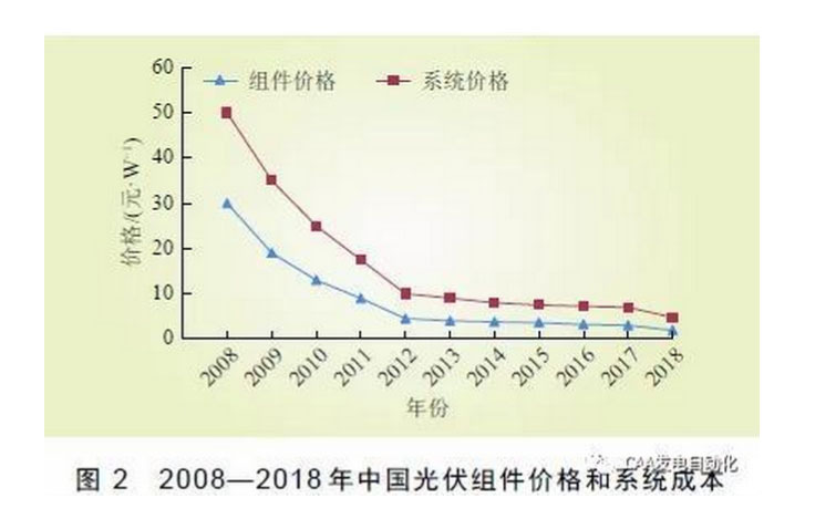 隨著光伏發(fā)電的技術(shù)進(jìn)步和產(chǎn)業(yè)升級(jí),以及市場(chǎng)更趨成熟,中國(guó)光伏發(fā)電成本持續(xù)下降,如圖2 所示。
