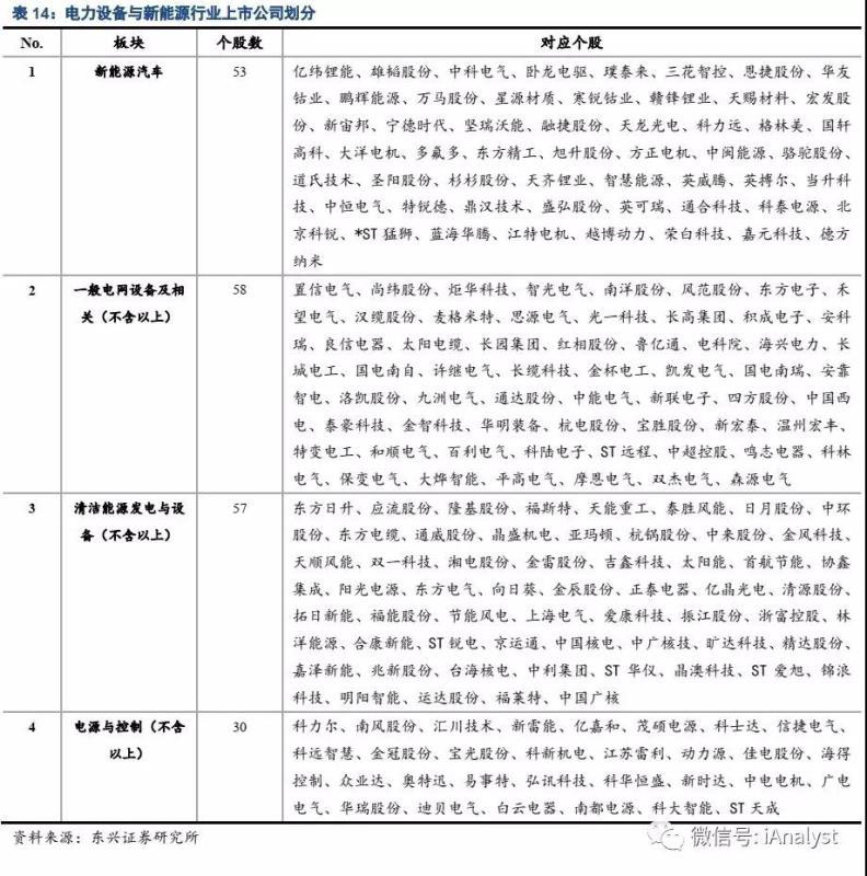 按照電力設備與新能源行業(yè)198家上市公司核心主營業(yè)務與行業(yè)產(chǎn)業(yè)鏈的對應關系,我們將該行業(yè)的 A 股上市公司劃分為4個板塊:新能源汽車、一般電網(wǎng)設備及相關、清潔能源發(fā)電與設備、電源與控制,如表14所示。