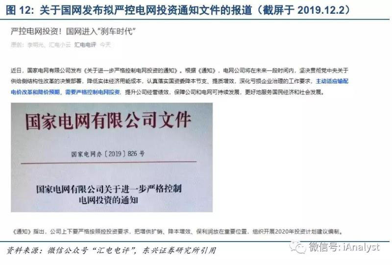 據(jù)微信公眾號“匯電電評”2019年12月2日報道(如圖12所示),國家電網(wǎng)公司(簡稱“國網(wǎng)”)發(fā)布《關于進一步嚴格控制電網(wǎng)投資的通知》,將“降低實體經(jīng)濟用能成本,認真落實國資委降本節(jié)支、提質(zhì)增效,深化虧損企業(yè)治理的工作要求,主動適應輸配電價改革和降價預期,需要嚴格控制電網(wǎng)投資”。該《通知》就嚴格控制電網(wǎng)投資,提出三點要求:1)以凈利潤為核心,不得在投資計劃外安排輸變電資產(chǎn)租賃,不得以投資、租賃或合同能源管理等方式開展電網(wǎng)側(cè)電化學儲能設施建設,不再安排抽水蓄能新開工項目;2)虧損單位不增新投資;3)新項目保證先落實送售電協(xié)議,后開工建設。