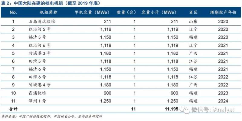 截至2019年底,在建核電機組有11臺,合計容量11.20GW,預計將于2020~2024年投產(chǎn),如表2所示。