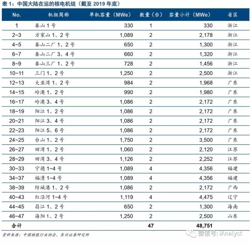 截至2019年底,我國大陸地區(qū)在運行核電機組有47臺,合計容量48.75GW,如表1所示。