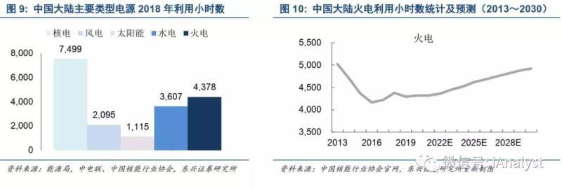 我們預計,未來十余年,核電年利用小時數(shù)將大概率不低于7,350h,并承擔基荷電源清潔化之大任;隨著消納進一步改善、“平價上網(wǎng)”導向下項目選址向優(yōu)勢資源區(qū)集中、海上風電建設加快,光伏、風電并網(wǎng)項目利用小時數(shù)到2030年有望分別達到1,180h、2,240h;隨著一些小容量機組逐步關停、行業(yè)整合提效,火電利用小時數(shù)逐步回升,預計2030年達到4,920h,如圖10所示。
