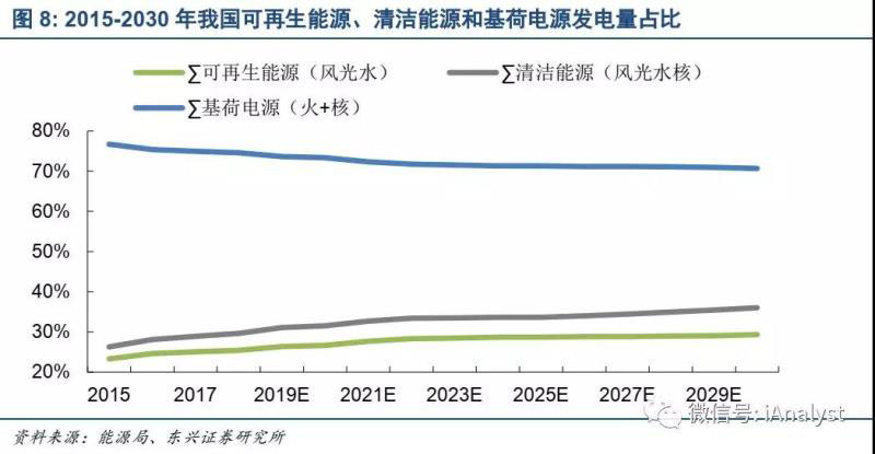 我們同時預計,2020年、2025年、2030年,火電對于發(fā)電量的貢獻,將分別降至68.4%、66.3%、64.0%,如圖7所示;可再生能源(風、光、水)發(fā)電量占比分別為26.7%、28.7%、29.3%,基荷電源(火電+核電)發(fā)電量占比分別為73.3%、71.3%、70.7%;清潔能源(風、光、水、核)發(fā)電量占比分別為31.6%、33.7%、36.0%??梢?,電力消費結(jié)構(gòu)在保證必要的基荷電源占比前提下實現(xiàn)一定的優(yōu)化,如圖8所示。