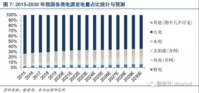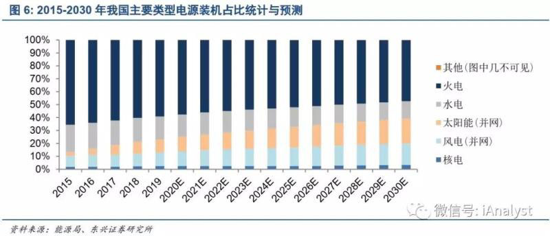 為滿足用電量增長、抑制平均能耗上升的需求,發(fā)電裝機亦將持續(xù)增長,且清潔能源占比將進一步提高。我們預計,2020年底、2025年底、2030年底,中國大陸各類電源裝機總?cè)萘繉⒎謩e達到2,124GW、2,566GW、2,930GW,火電裝機占比分別降至57.6%、52.0%、47.3%,如圖6所示。