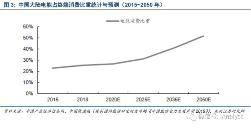 我們認為,電能替代將成為未來多年的用電量重要增量來源。據(jù)中國產(chǎn)業(yè)經(jīng)濟信息網(wǎng)2019年11月1日報道,2017、2018年全國電能替代量分別達1286億kWh、1577億kWh,占當年全社會用電量的2.0%、2.3%;電能占終端能源消費比重從2015年的22.9%提高到2018年的25.5%;另據(jù)《中國能源報》(2019年12月9日第2版)援引國網(wǎng)能源研究院發(fā)布的《中國能源電力發(fā)展展望2019》預測,到2020、2025、2035、2050年,電能占終端能源消費比重將分別達到26.5%、31.4%、40.6%、51.7%。上述統(tǒng)計及預測數(shù)據(jù)如圖3所示。