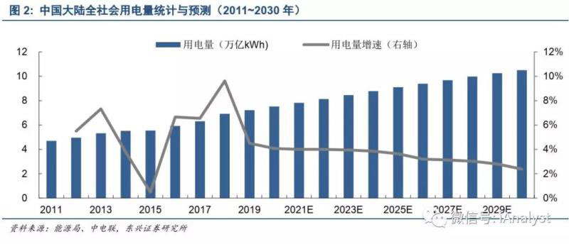 展望未來十余年,結(jié)合電能替代、工商業(yè)發(fā)展、人口增長等因素的驅(qū)動,以及經(jīng)濟調(diào)結(jié)構(gòu)、控能耗等相關政策落實推進,我們預計,2020年、2025年、2030年,中國大陸全社會用電量將分別達到7.52萬億kWh、9.10萬億kWh、10.50萬億kWh,2019~2025年、2025~2030年的年均復合增速分別為3.92%、2.90%,如圖2所示。