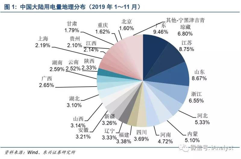 我國是人口大國,且電力資源以自給自足為主。據(jù)能源局發(fā)布的統(tǒng)計數(shù)據(jù),2019年中國大陸全社會用電量達到7.2255萬億kWh,我們測算,較2011年的年均復合增速為5.52%。從2019年前11個月各省區(qū)(含直轄市)用電量數(shù)據(jù)來看,21個省區(qū)的用電量占比各自超過2%,14個省區(qū)的用電量占比各自超過3%;其中,廣東、江蘇、山東、浙江的用電量居前,皆超過6%,合計占比33.4%,如圖1所示。