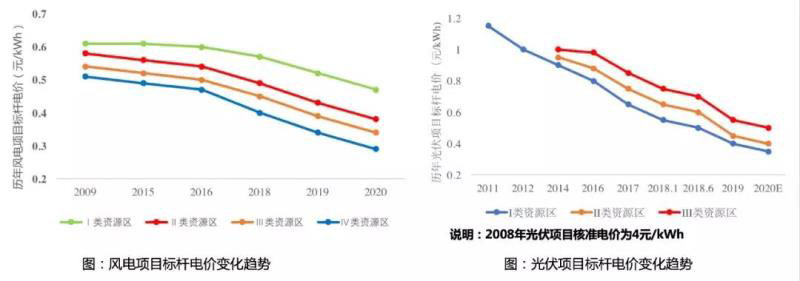 2019年之前,風電和光伏項目采用標桿電價政策,標桿電價逐年下降;不同時間并網(wǎng)的項目電價不同,具體如下圖所示;