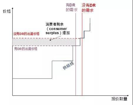 為了激勵(lì)DR參與市場(chǎng),補(bǔ)償費(fèi)用并非基于邊際定價(jià),而是基于消費(fèi)者剩余增加(consumer surplus) 的三分之一來(lái)計(jì)算。市場(chǎng)出清機(jī)制運(yùn)行兩次,一次是有DR參與的,另一次是沒(méi)有DR參與的,具體情況如圖5所示。DR的提供能降低了批發(fā)電力市場(chǎng)出清價(jià)格,從而增加消費(fèi)者剩余;DR提供者的補(bǔ)償費(fèi)用是消費(fèi)者剩余增加的三分之一,最高可達(dá)4500新加坡幣/兆瓦時(shí)(折合人民幣23元/千瓦時(shí))。