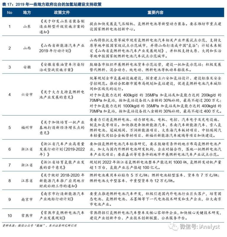 早在2019年3月出臺(tái)的《關(guān)于進(jìn)一步完善新能源汽車推廣應(yīng)用財(cái)政補(bǔ)貼政策的通知》中,就已經(jīng)明確提出,“地方應(yīng)完善政策,過渡期后不再對(duì)新能源汽車(新能源公交車和燃料電池汽車除外)給予購(gòu)置補(bǔ)貼,轉(zhuǎn)為用于支持充電(加氫)基礎(chǔ)設(shè)施“短板”建設(shè)和配套運(yùn)營(yíng)服務(wù)等方面。”隨后各地方政府出臺(tái)相應(yīng)補(bǔ)貼政策支持加氫站建設(shè),詳見表17。