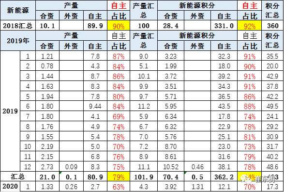 2020年1月總體新能源車產(chǎn)量4.3萬臺,積分達到17萬分,合資產(chǎn)量同比較強。2020年合資企業(yè)新能源產(chǎn)品逐步到位,新能源產(chǎn)量積分增長迅猛,體現(xiàn)合資新能源的加速增長態(tài)勢。