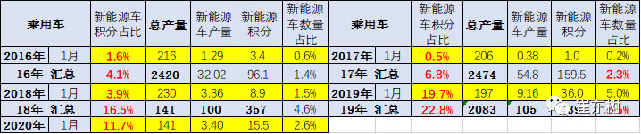 全國新能源車的總體續(xù)航和新能源積分表現(xiàn)近兩年持續(xù)提升后,2020年1月出現(xiàn)全面下降,1月新能源乘用車產(chǎn)4.3萬臺、降53%、單車3.6分/臺,降10%、積分比例達12%,降8個百分點。