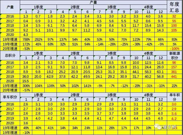 18年1-12月的新能源乘用車生產(chǎn)100萬臺,形成新能源積分361萬分,每臺乘用車平均3.6分,較17年的2.9分提升25%。19年新能源乘用車產(chǎn)量105萬臺,較2018年同期增長5%,而新能源積分達到441萬分,較18年同期增長22%。