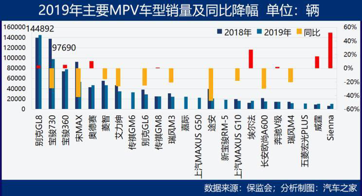 2019年,商用的合資品牌高端車(chē)型、進(jìn)口車(chē)型銷(xiāo)量大幅上漲,比如埃爾法增長(zhǎng)27%,國(guó)產(chǎn)奔馳V級(jí)增長(zhǎng)1.9%、進(jìn)口奔馳V級(jí)增長(zhǎng)181%,威霆增長(zhǎng)17.16%,Sienna增長(zhǎng)52%,年銷(xiāo)量接近15萬(wàn)輛的別克GL8增長(zhǎng)3.9%……與之形成對(duì)比的是,寶駿730減少了29%,宋MAX減少42%,菱智減少15.7%,瑞風(fēng)M3減少21%……