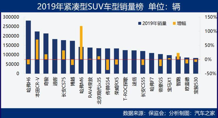 2019年的緊湊型SUV銷(xiāo)量可謂冰火兩重天。Top 20車(chē)型中,中國(guó)品牌車(chē)型除哈弗M6外全部負(fù)增長(zhǎng)。冠軍車(chē)型并未花落別家,還是哈弗H6,全年銷(xiāo)售28.1萬(wàn)輛,不過(guò)同比減少了17%。日系“SUV三劍客”咄咄逼人,本田CR-V全年銷(xiāo)售22.3萬(wàn)輛,同比增長(zhǎng)70%,奇駿銷(xiāo)售21.3萬(wàn)輛,增長(zhǎng)18%,唯一銷(xiāo)量下降的是逍客,但降幅微乎其微,只有0.77%,全年銷(xiāo)售18.3萬(wàn)輛。德系在2018年下半年推出的兩款新車(chē)途岳、T-ROC探歌,2019年的銷(xiāo)量均超過(guò)了12萬(wàn)輛。